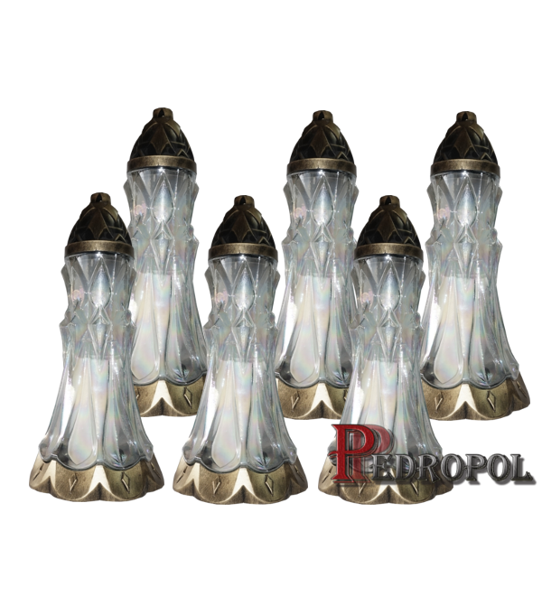 Zgrzewka zniczy szklanych z wkładami parafinowo-olejowymi. Wzór znicza:Z-253 złoto. Wysokość znicza: 40cm.